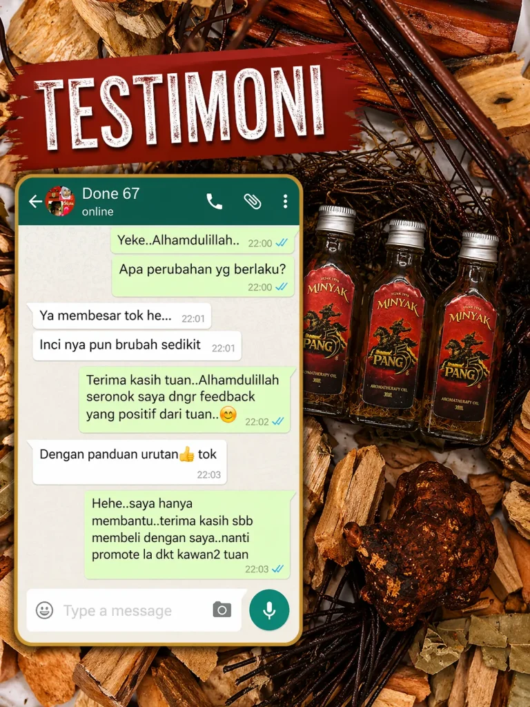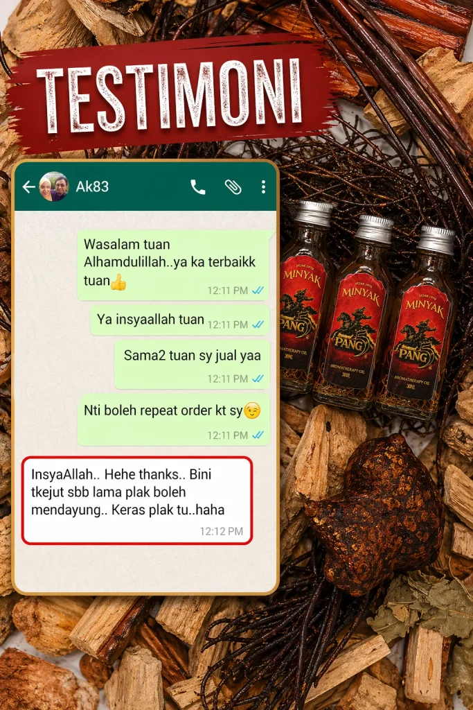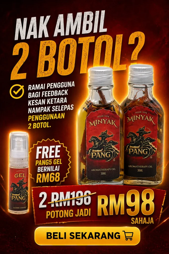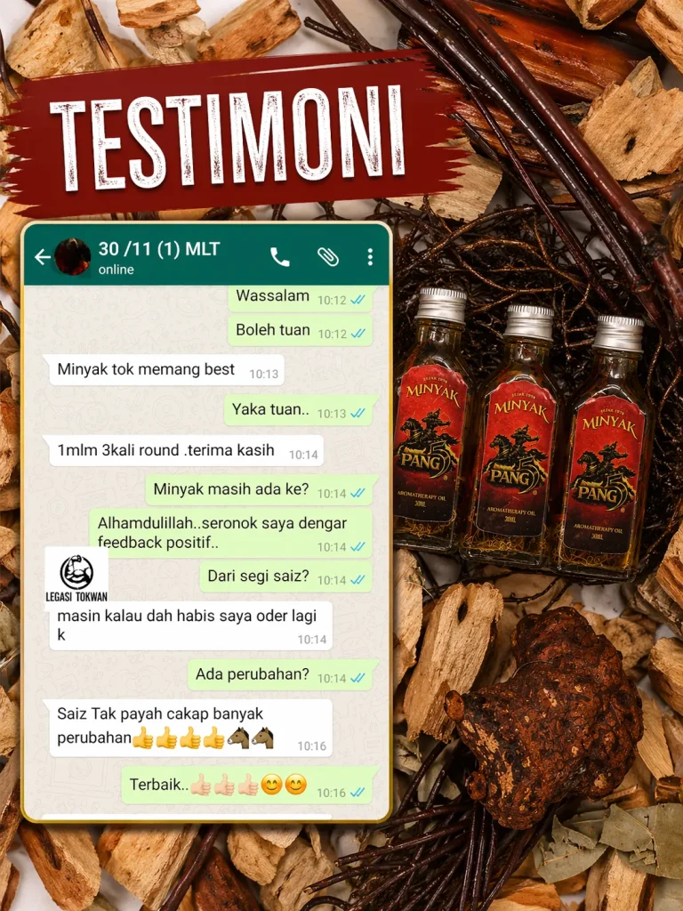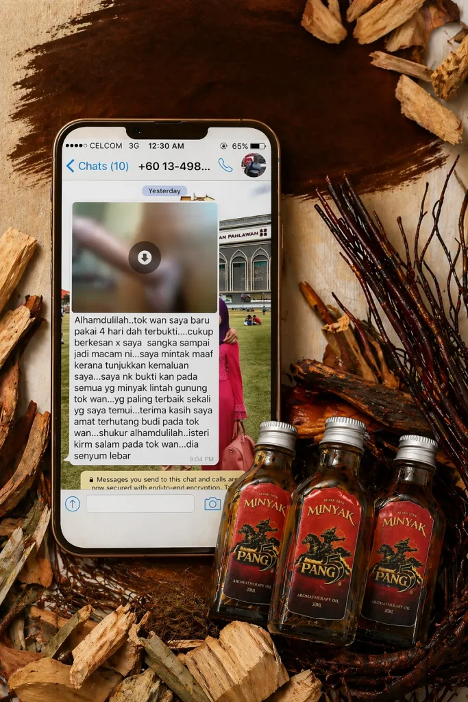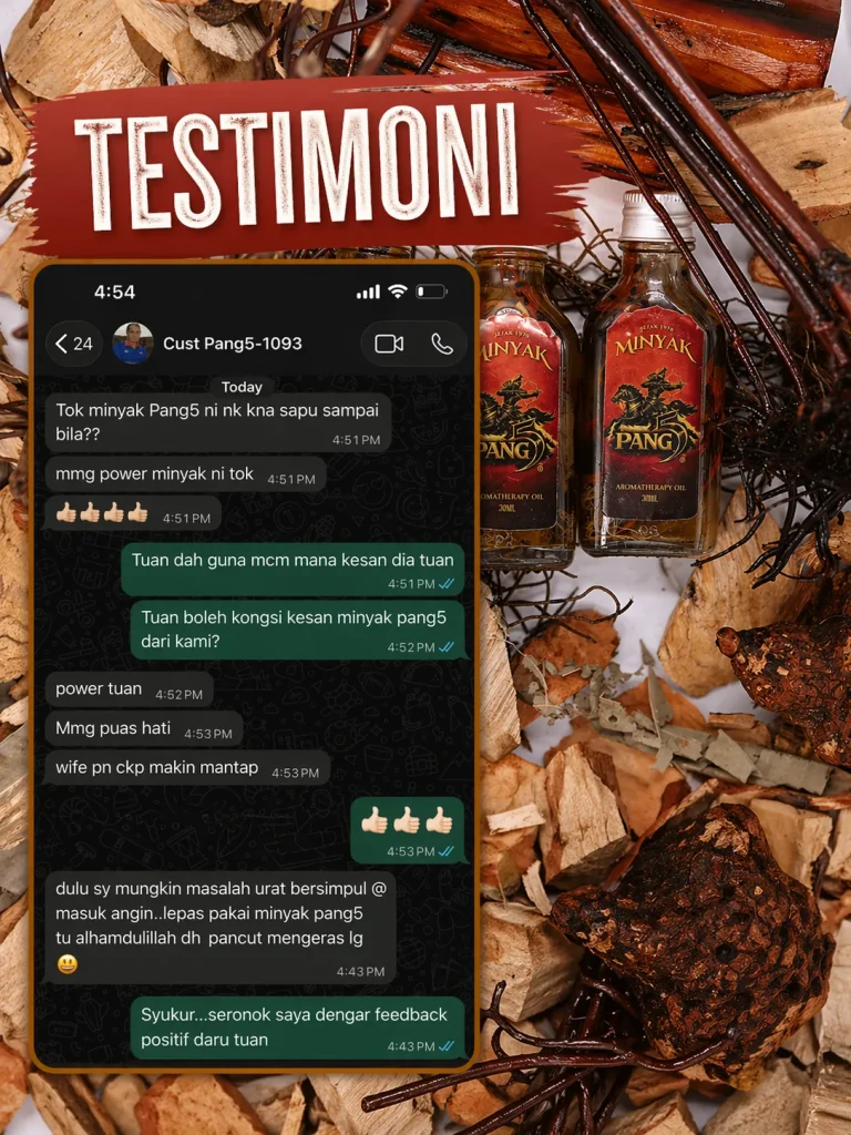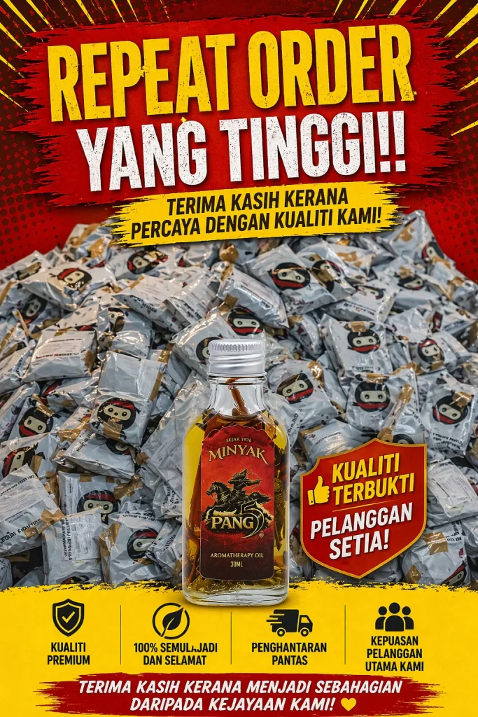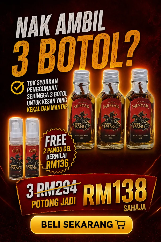 PENAFIAN: Produk ini adalah minyak untuk kegunaan luaran sahaja. Bukan ubat dan tidak bertujuan untuk mendiagnosis, merawat, menyembuhkan atau mencegah sebarang penyakit. Keberkesanan penggunaan bergantung kepada kesesuaian individu dan pengalaman setiap pengguna mungkin berbeza. Gunakan mengikut arahan yang disyorkan. Hentikan penggunaan jika berlaku ketidakselesaan atau iritasi. Elakkan terkena mata, mulut, luka terbuka dan kawasan sensitif. Simpan di tempat kering serta jauh daripada capaian kanak-kanak. Jika mempunyai masalah kesihatan atau kulit sensitif, dapatkan nasihat profesional sebelum penggunaan.