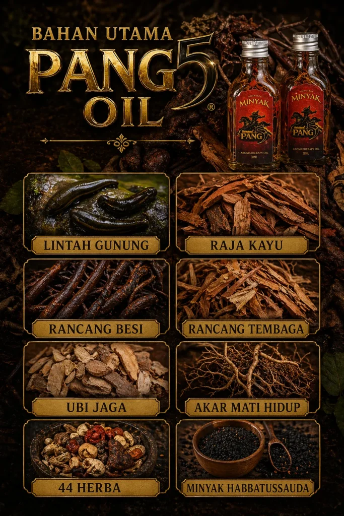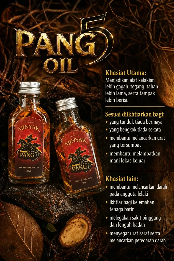 PANG5 Oil merupakan minyak herba tradisional dari bumi Langkawi yang diolah daripada petua lama turun-temurun. Dirumus dengan 48 herba terpilih menjadi minyak urut lelaki berasaskan bahan semula jadi.